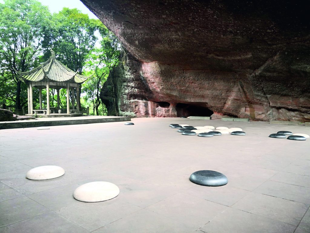 偌大的景区,只我一人在游览,我心中只有一个想法——努力寻觅那个仙人对弈的棋室,然而东奔西走,爬上翻下,一直没有找到,莫非还在更遥远的深山密林?不觉有点沮丧。继续攀援前行,感觉上面有人影晃动,难道还有早游的先行者?果然,两人正在下山,原来是来自上海的一位年轻人带着他的岳父来旅游观光,他告诉我,那座对局的棋室就在上方不远。终于来到了那个一千六百年前下棋的场所,经过大自然的鬼斧神工,一座由时间雕刻和流水侵蚀的石桥完整地呈现眼前,石桥下自然形成一个如同两个篮球场般大小通透的空间,有点像曾在桂林旅游看到的月亮山,只是月亮山是满月,烂柯山是半月,月亮山只可仰视,烂柯山则可进入。据介绍,桥拱呈东西走向,南北中空,桥洞高12至13米,跨度约40米,宽约30米,面积大约700平方米。两面赭红色的山体为桥头堡,前后贯通明亮,周边林木葱茏,石室掩映山中,真是个世外桃源。室内的地面有一副由人工制作的巨大的围棋盘,或称世界上最大的棋盘,数十枚黑白棋子点缀其中,不知是一局棋的布局,还是一局棋结束后棋子未曾收完(徐霞客游记中描写永新县的石棋盘时用“棋残子未收”来描述)。我心怀虔敬之心,轻轻地在棋室漫步,踏寻仙人的踪迹,好似一位观棋不语的棋迷,生怕打扰了对局者的长考,小心维护比赛场地的宁静。
