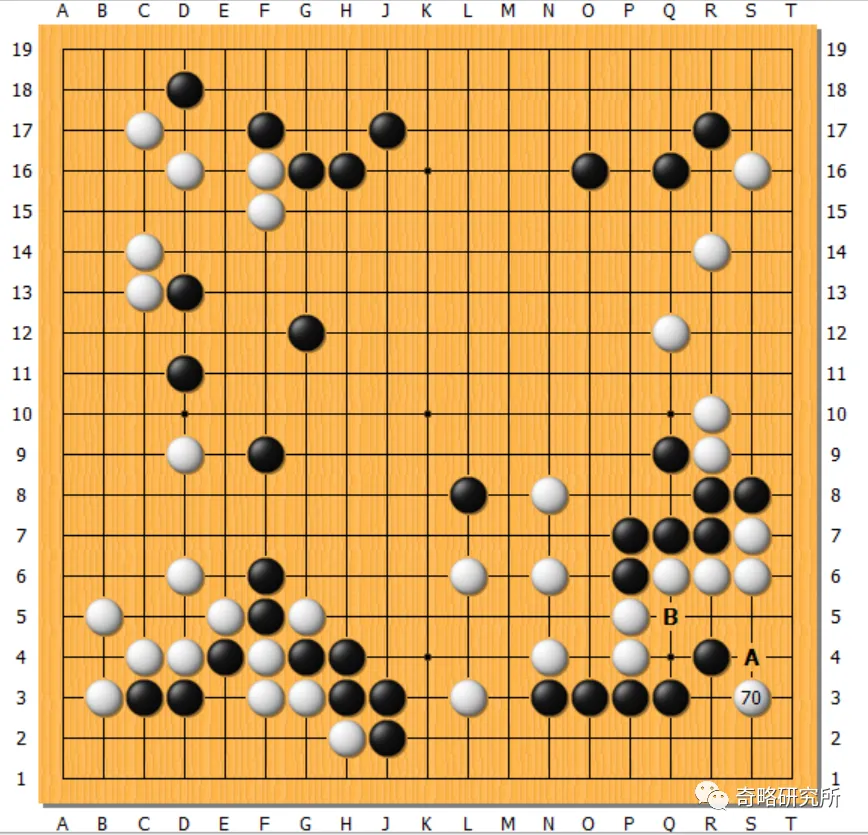 棋至中盘,双方在右下角展开接触战。李昌镐出人意料地对处于攻势的黑棋展开反击。就在情势看上去不妙之时,李昌镐祭出第70手透点的手筋。这着棋高效地防住了B位的断点。如果黑方在A位挡,则白方不怕黑在B位断,可以腾出手来全力攻击外围黑棋。实战林海峰选择处理上面黑棋,而李昌镐如愿抢到A位爬回,取得实地优势。